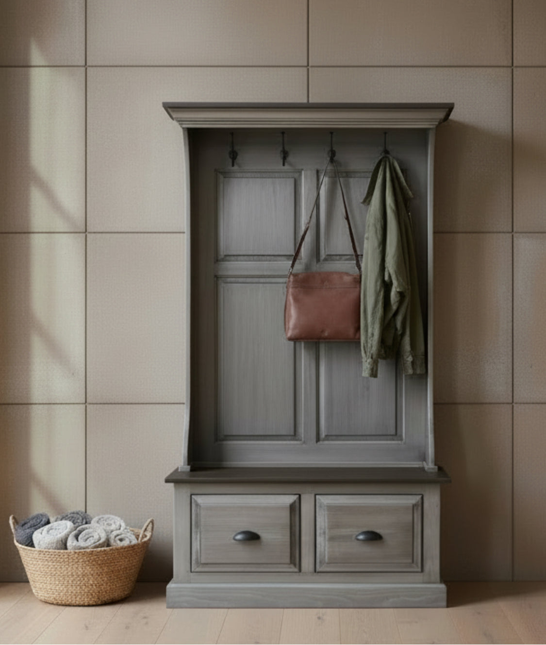 Amish made Hall Bench featuring 2 drawers and 4 hooks crafted from pine with a maple seat. Hall Benches, also known as Hall Trees, can be ordered in many of our stain and/or color options.